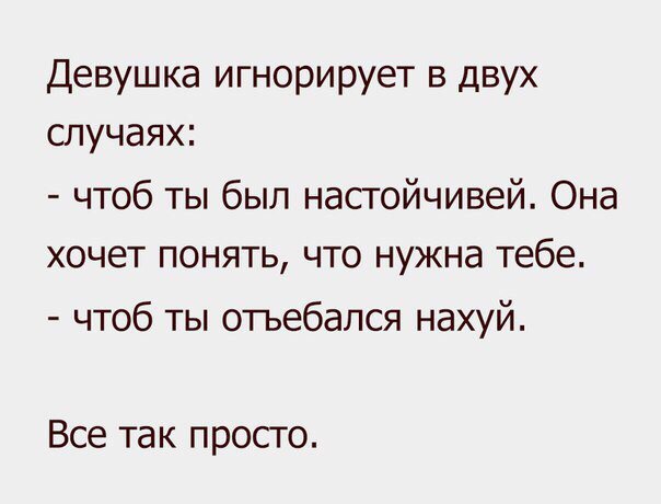Естественно, это далеко не все возможные предлоги по которым девушка игнорит парня, но, думаю самые основные. Что делать в такой ситуации? Мой совет в любом случае не будет отличаться оригинальностью: как я уже говорил выше, встретьтесь и обсудите всё лично, чтобы не оставалось недомолвок.