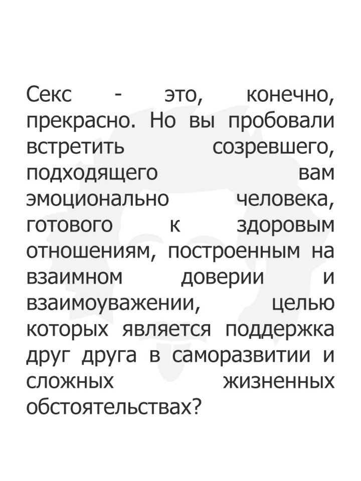 Отношения — это не просто половой акт, это нечто большее. Это не наличие или отсутствие инфекции и способность к эрекции и эякуляции. В здоровых и зрелых отношениях вообще не будет возникать вопроса, есть оргазм или нет его, потому что отношения становятся настолько позитивными, многогранными и красивыми, что зацикленность на каких-то деталях исчезает вовсе.