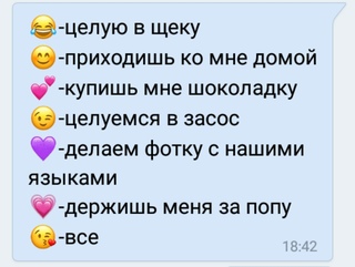 Ответы 1. Пришлите мне свою уродливую фотографию 2. Напиши своему бывшему Я люблю тебя и пришли мне скриншот 3. Пришлите мне свое фото с поцелуями 4. Позвони мне и скажи, что я люблю тебя 5. Отправьте свою сексуальную фотографию 6. Цель меня 7. Пришли мне свой любимый порно клип 8. Какая поза тебе нравится во время секса? 9.Закажите сексуальную игрушку и пришлите мне доказательство 10. Расскажи мне, как ты теряешь девственность