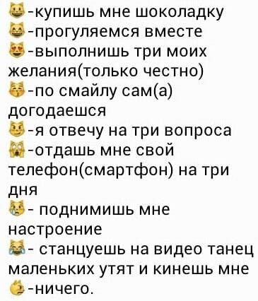 Ответ 1. Скажи, какие у тебя со мной отношения? 2. Напишите мое имя сердечками в своем статусе 3. Дай мне звезду по-твоему 4. Расскажите мне о ваших отношениях 5. Скажи мне, кто тебе нравится 6. Скажи мне имя твоего парня 7. Спой для меня романтическую песню 8. Сделайте мой образ вашего WhatsApp DP 9. Поболтать со мной 30 мин.; 10. Подзаряди мой телефон.