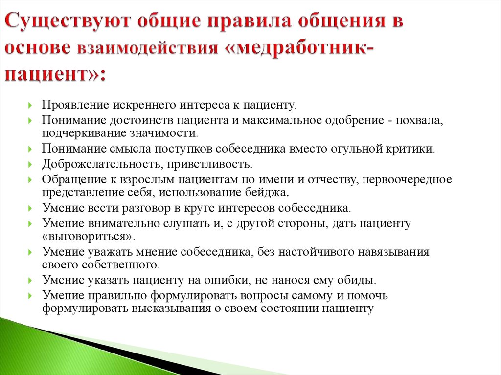 Правила общения с людьми включают следующее: не рекомендуется перебивать собеседника, давать ему советы, критиковать его, резюмировать его речь, отвлекаться на подготовку ответной реплики. Это лучше сделать после приема сообщения и его уточнения. Следует соблюдать последовательность подачи информации. Не рекомендуется переходить к новой информации, не убедившись в том, что партнер верно воспринял предыдущее высказывание. Во время разговора атмосфера должна носить доверительный и уважительный характер. К собеседнику нужно проявлять эмпатию.