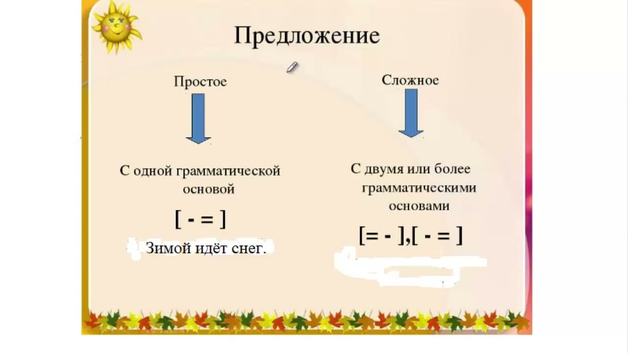 | Если простое: 5. Охарактеризовать предложение по наличию главных членов предложения: двусоставное или односоставное, указать, какой главный член предложения, если оно односоставное (подлежащее или сказуемое). 6. Охарактеризовать по наличию второстепенных членов предложения: распространённое или нераспространённое. 7. Указать, осложнено ли чем-либо предложение (однородными членами, обращением, вводными словами) или не осложнено. 8. Подчеркнуть все члены предложения, указать части речи. 9. Составить схему предложения, указав грамматическую основу и осложнение, если оно есть. | Если сложное: 5. Указать, какая связь в предложении: союзная или бессоюзная. 6. Указать, что является средством связи в предложении: интонация, сочинительные союзы или подчинительные союзы. 7. Сделать вывод, какое это предложение: бессоюзное (БСП), сложносочинённое (ССП) сложноподчинённое (СПП). 8. Разобрать каждую часть сложного предложения, как простое, начиная с пункта №5 соседнего столбца. 9. Подчеркнуть все члены предложения, указать части речи. 10. Составить схему предложения, указав грамматическую основу и осложнение, если оно есть. |