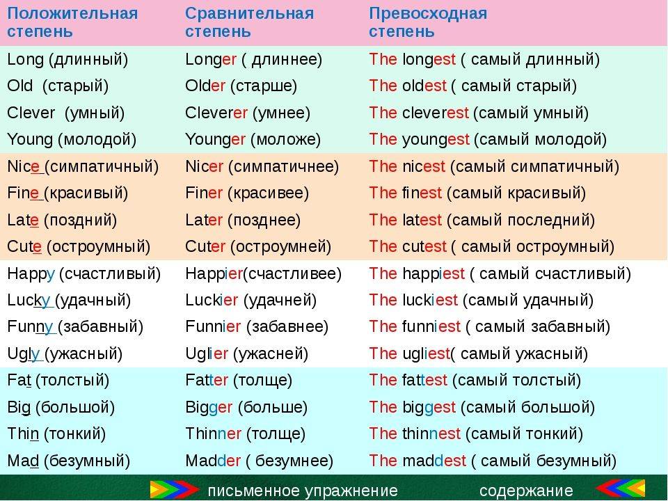 В таблице ниже приведены правила образования прилагательных в сравнительной и превосходной степени: