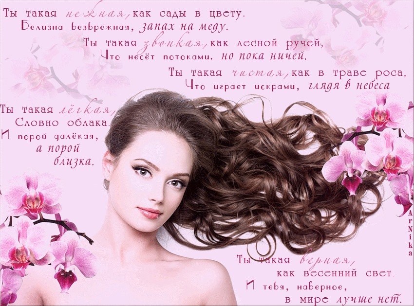 Твои волосы пахнут лучше любого цветка, твои глаза сильнее любого магнита притягивают к себе взгляд, твой образ невозможно забыть. Твой гибкий стан подобен молодой березе. Мужчины откровенно тебя рассматривают при встрече и не хотят тебя отпускать, увидев хоть раз, пытаясь подобрать ключи к твоему сердцу.
