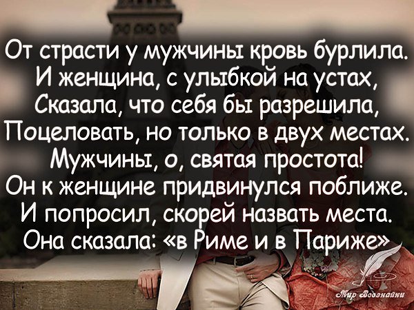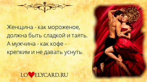 7. любовь — как обед: женщина сначала подает холодное, потом горячее. Но мужчина — как ребенок: хочет начать сразу со сладкого. И если женщина ему это позволит, он быстро потеряет аппетит.