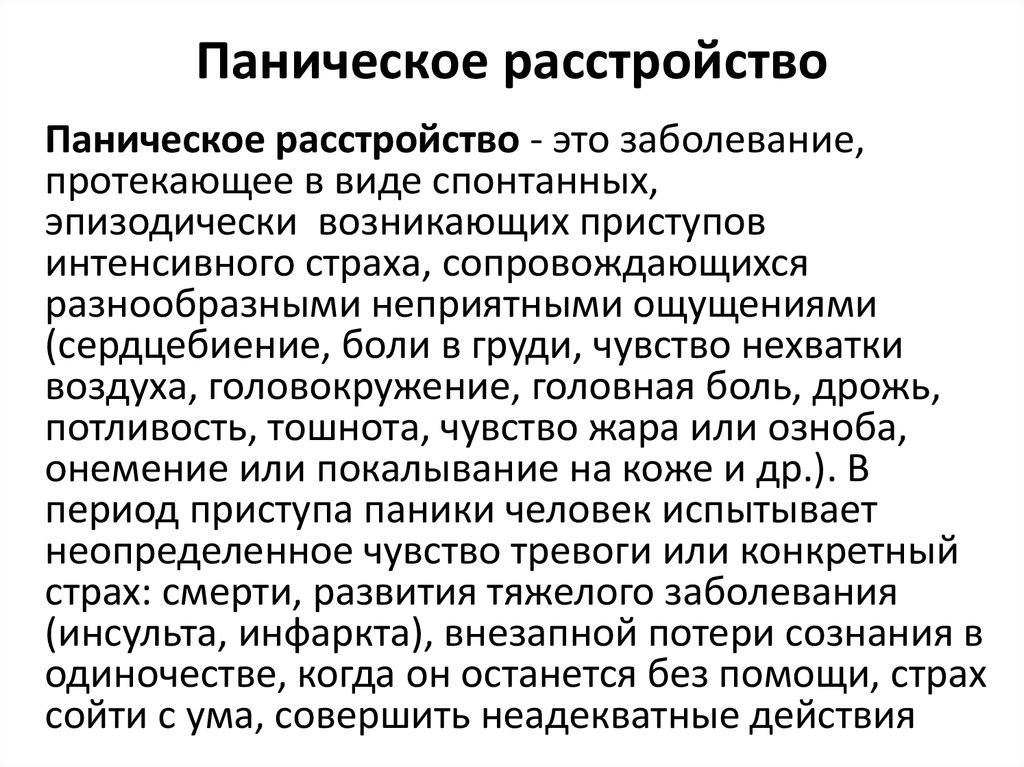 Под панической атакой понимают особое состояние — приступ, основу которого составляет панический страх, тяжелейшая тревожность в сочетании с крайне неприятными психическими и физическими реакциями. При этом уровень страха и паники никак не соизмерим с тем провокатором, который мог стимулировать приступ. По сути, триггеры не опасны для жизни, в них нет сильной угрозы: это могут быть совещание на работе, внезапно свалившиеся дела, бытовые неурядицы и т.д.