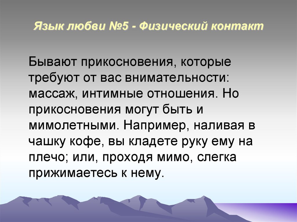 Люди, использующие физический контакт в качестве языка любви, чувствуют себя любимыми, когда получают физические знаки привязанности, включая поцелуи, держание за руки, объятия на диване и секс. Физическая близость и прикосновения могут быть невероятно позитивными и служить мощным эмоциональным связующим звеном для людей с этим языком любви. Его корни уходят в наше детство, некоторые из нас чувствовали глубокую привязанность и любовь своих родителей только тогда, когда их брали на руки, целовали или прикасались.