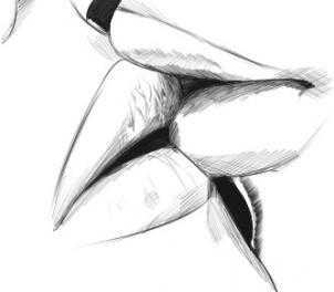 Фото 17. Далее прорисуем ноги. Штрихи наносим по изгибу ног. На нижней части ног (под коленями) тон делаем чуть темнее: