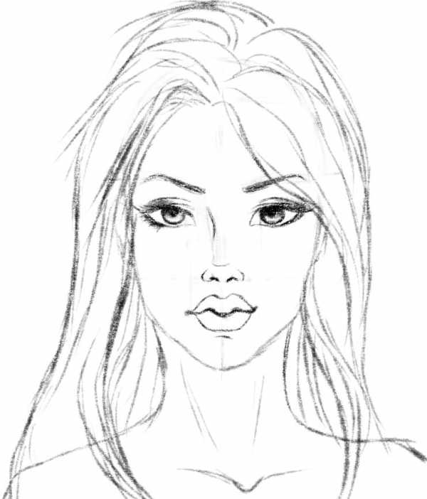 Фото 13. Прорисуем черты лица женщины. Сильно упор на прорисовку лица не делаем, потому что основная наша задача – научится рисовать женщину в полный рост, а именно – тело. Вы можете изучить мой отдельный урок «как нарисовать женский портрет», где я подробно прорабатываю детали лица девушки: