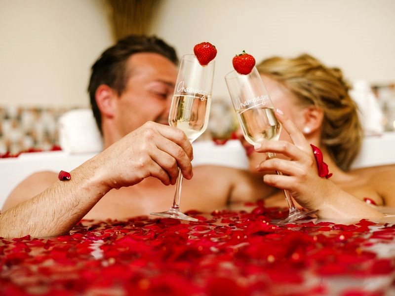 - Помните о том, что романтическая встреча для девушки предполагает соответствующий антураж. Позаботьтесь о классических атрибутах: свечах, лепестках роз и прочих «красивостях», которые позволят открывать что-то новое с каждой минутой. Если у вас «финансы не поют романсы», то можно наполнить ванну шампанским и насладиться купанием, утопая в пузырьках.