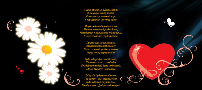 - Ты самый родной и любимый человек. Я люблю тебя всей душой и не представляю жизни без тебя. Я готов пойти за тобой хоть на край света, лишь бы только смотреть в твои красивые глаза и видеть каждый день твою очаровательную улыбку.