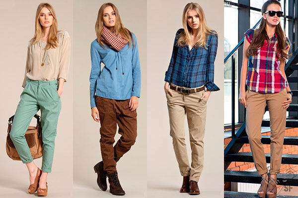 Хотя командир полка и создал модный цвет хаки для брюк-чинос, современные модницы и дизайнеры не желают стоять на месте, придумывая новые цветовые сочетания с этой моделью.