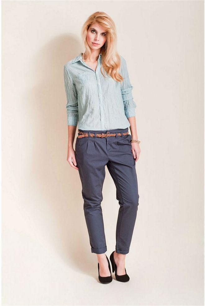 Брюки-чинос нередко заменяют джинсы в женском гардеробе. Они также удобны и практичны, а если выбрать их в синей цветовой гамме станут невероятно универсальны.