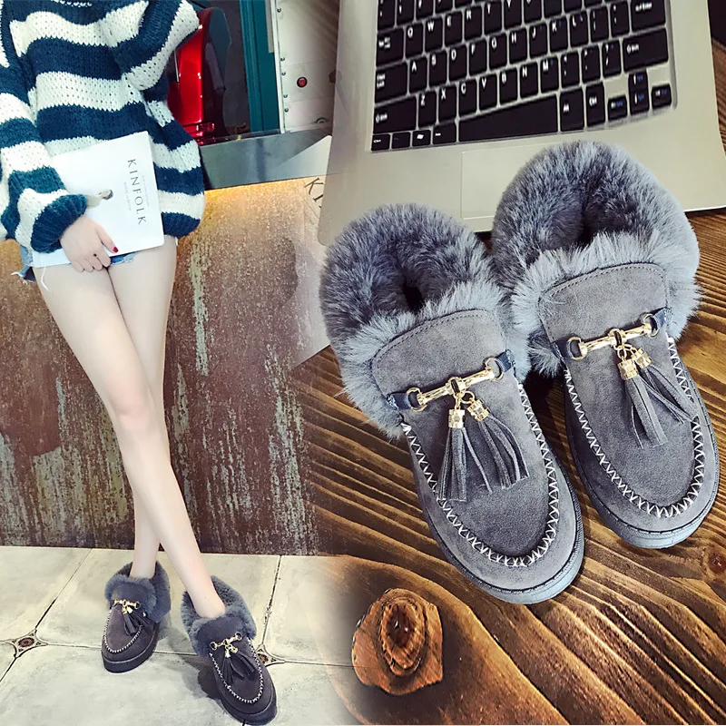 Женские меховые мокасины отлично сочетаются с вязаной одеждой, джинсами и классическими брюками.