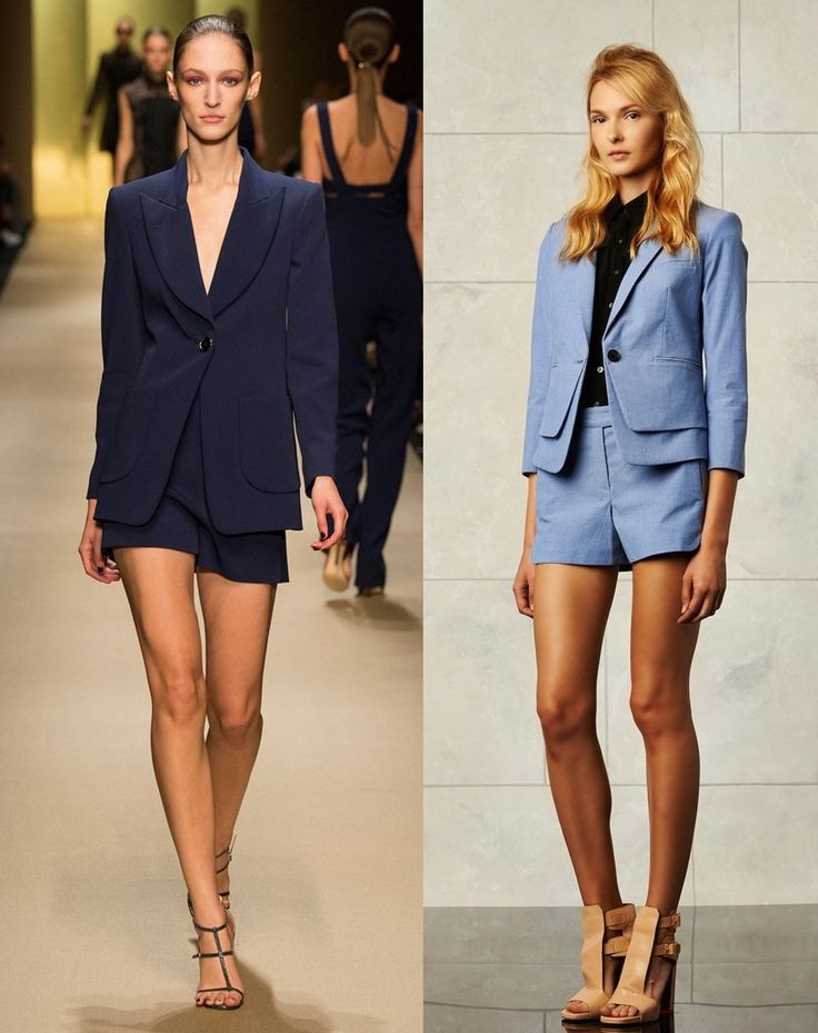 Жакет от костюма легко сочетается с другими шортами. Важно учитывать лишь цветовой баланс. К джинсовым вещам подойдет любой цвет жакета, здесь задача упрощается.