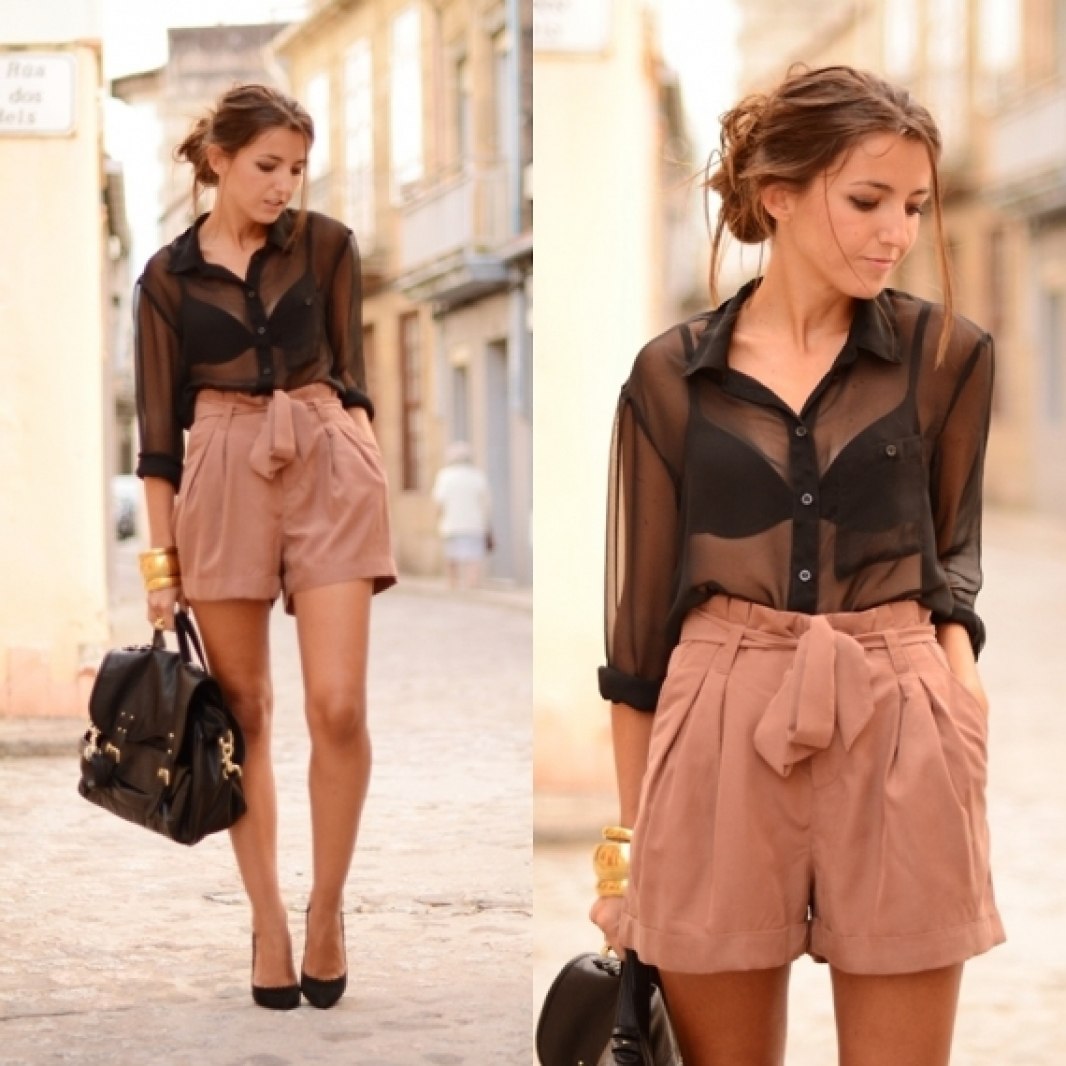 Классические чёрные шорты с высокой талией — это беспроигрышный вариант. Их можно носить под свободную футболку, с майкой, с блузой и пиджаком. Их можно надевать с телесными колготками.