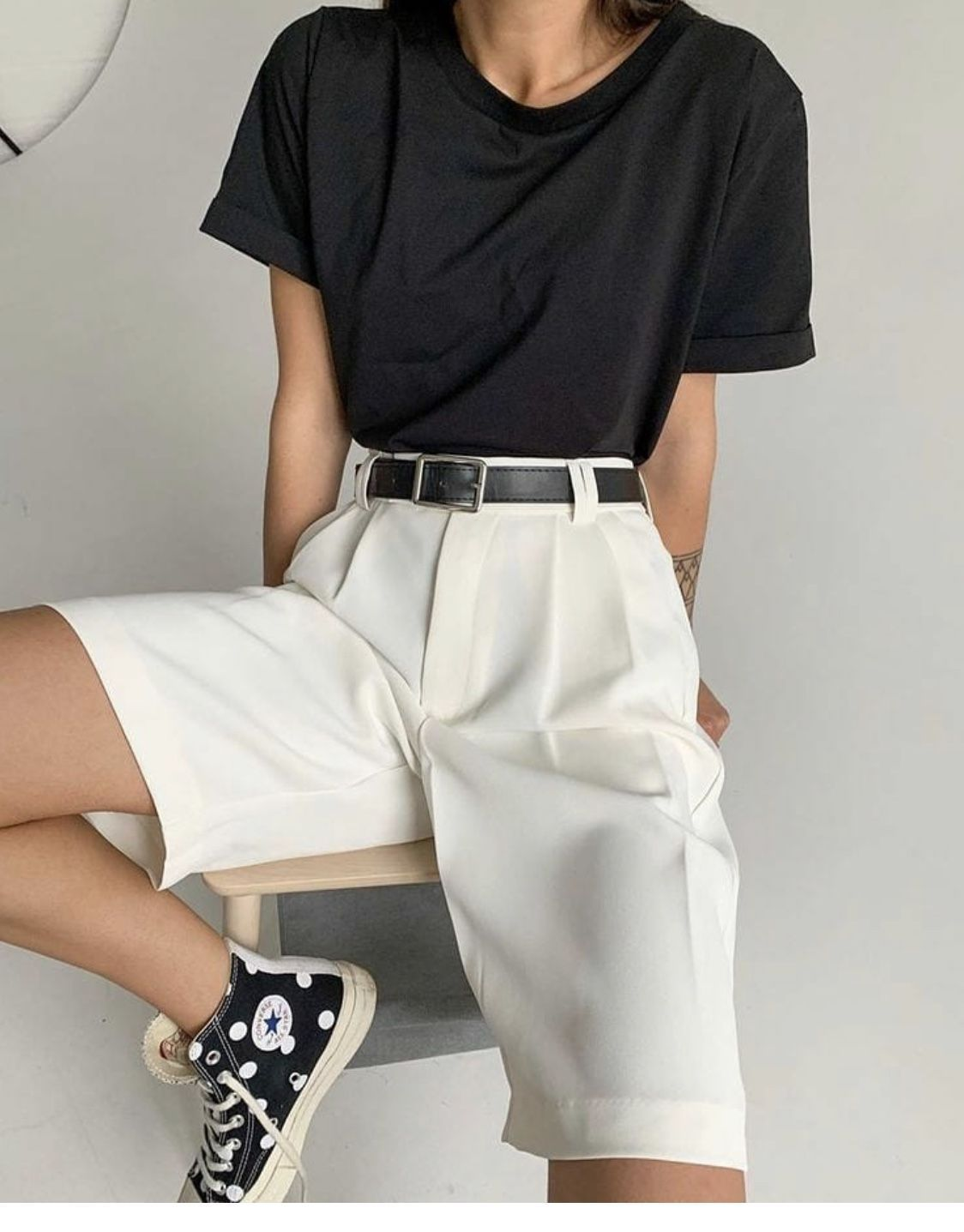 Девушка в белых шортах точно не останется без внимания. Можно пойти стандартным путём, скомбинировав белый низ и чёрный верх.