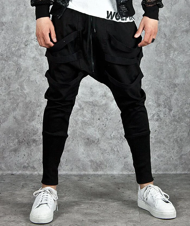 Мужские крутые спортивные штаны с большими карманами на манжетах /черные/