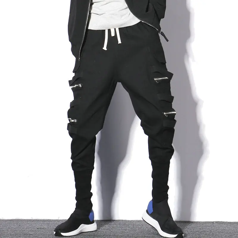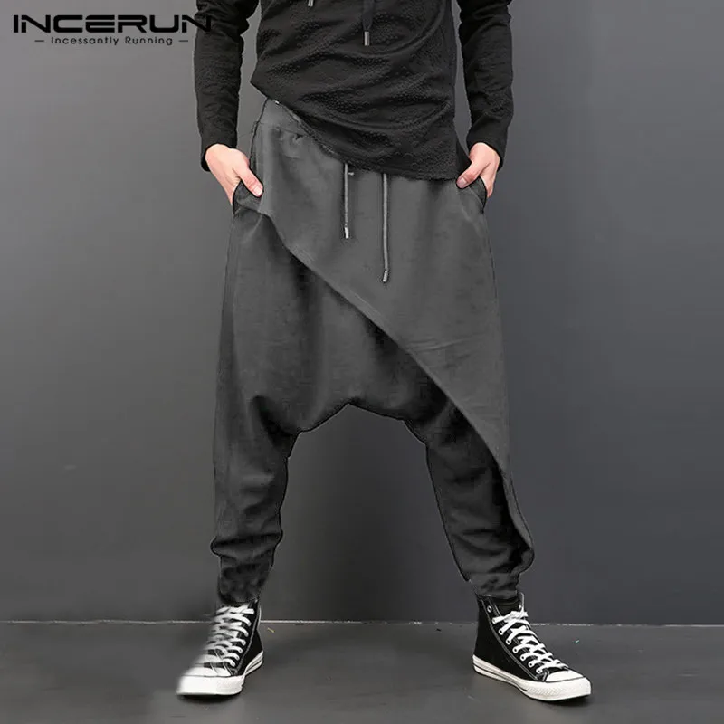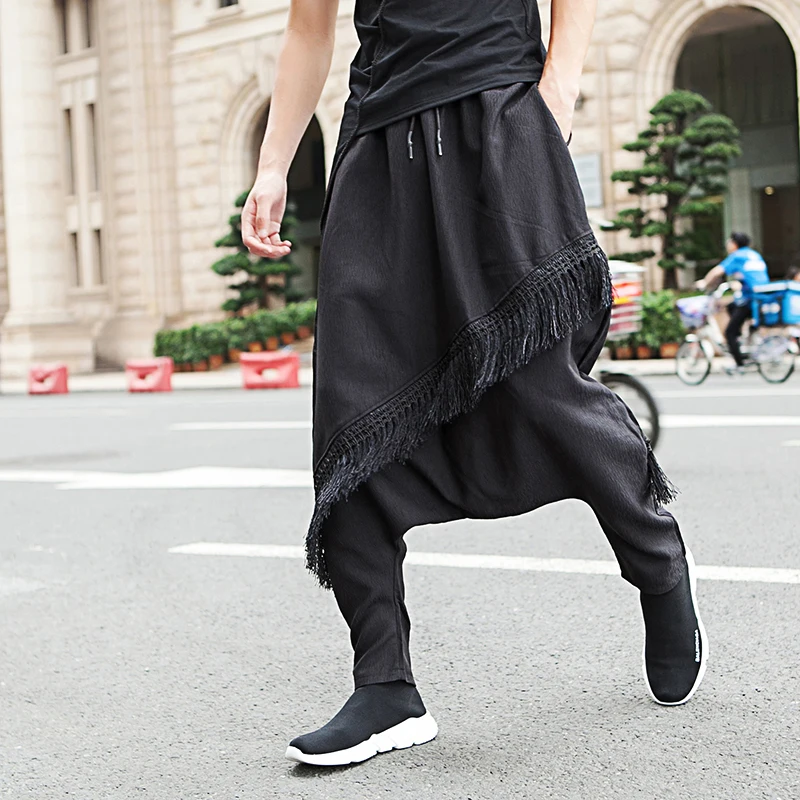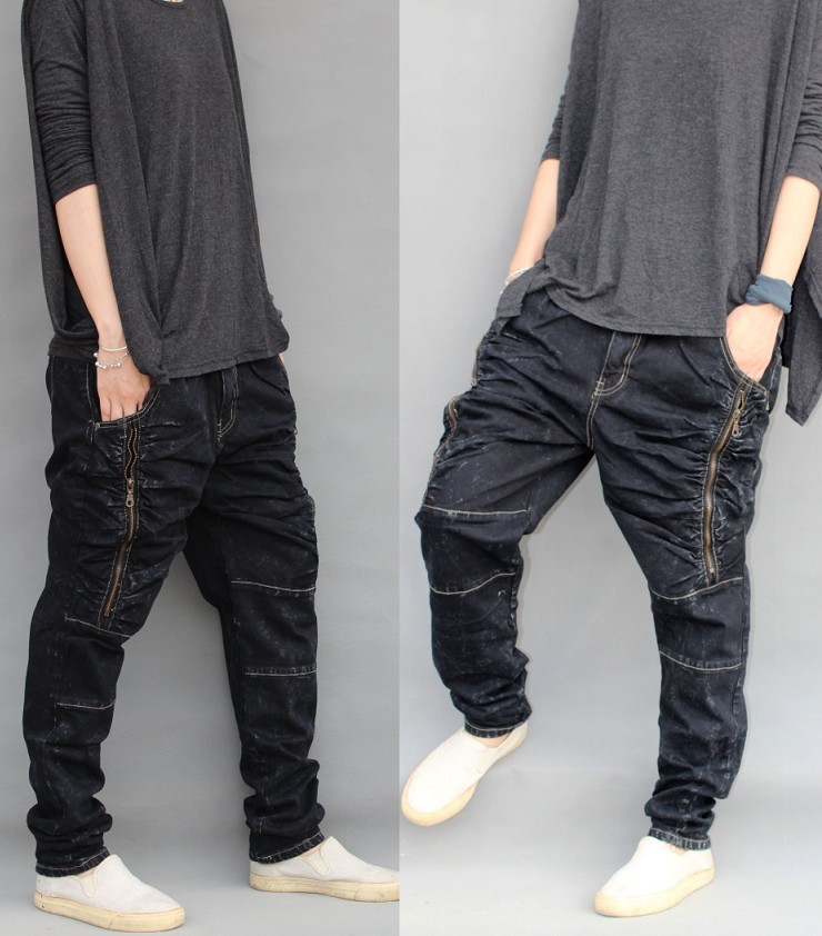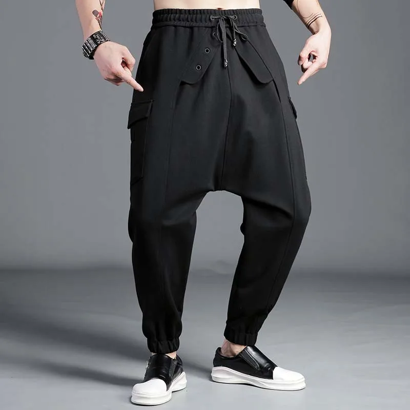 Мужские штаны широкие с мотней тёмно-синие японский уличный стиль