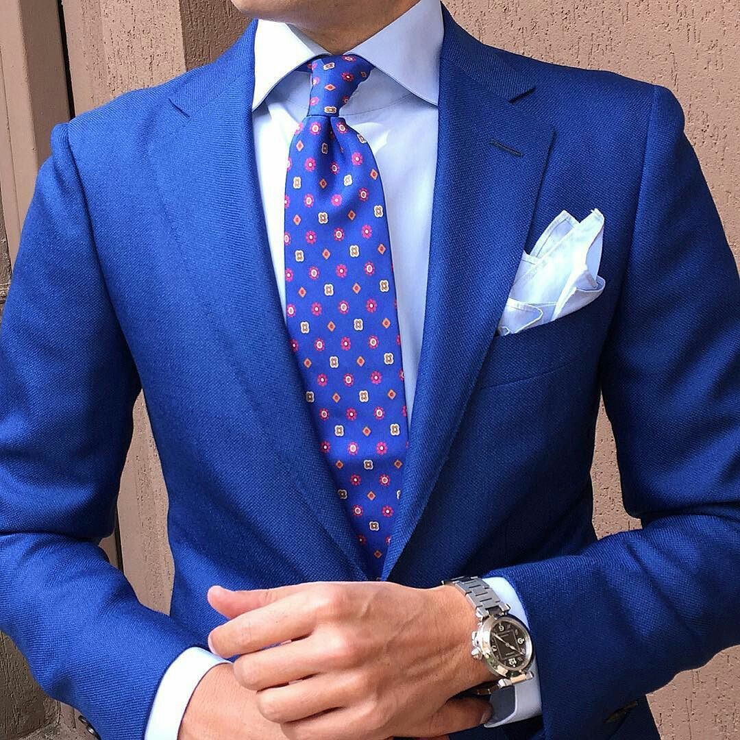 Стилисты рекомендуют подбирать галстук под цвет костюма. Однако, возможны варианты смелого сочетания синего костюма с бордовым, красным или черным галстуком, а также с галстуком с оригинальным принтом.