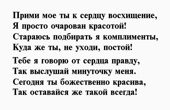 - Комплимент должен идти от сердца. Да, именно от чистого сердца, совершенно искренне. Фальшь дамы чувствую за версту, комплименты-копипасты тем более. Так что попробуйте придумать что-то свое.