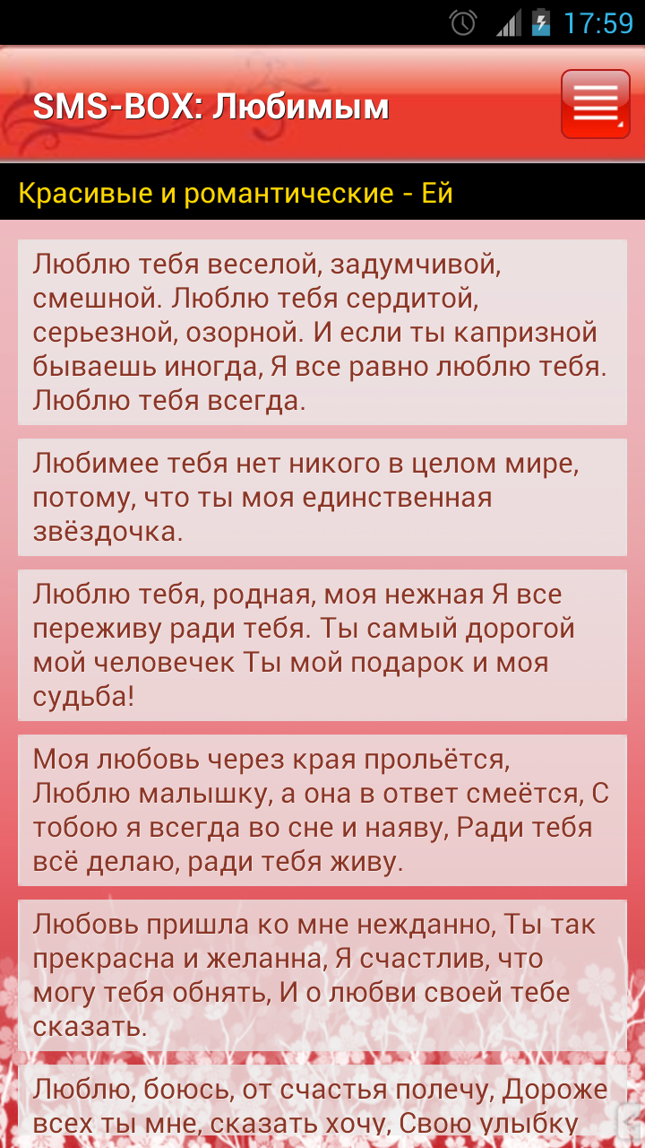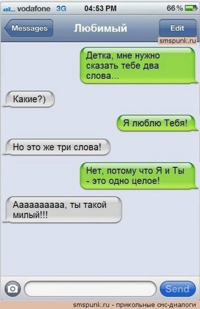 Здесь собрано множество интересных и милых сообщений, идеально подходящих для того, чтобы отправить в СМС любимой.Только представь, как она обрадуется, когда получит от тебя сообщение с признанием в любви или просто красивое пожелание удачного дня или спокойной ночи. Девушке очень важно знать, что она желанна, что тебе ее не хватает, что ты очень сильно скучаешь по ней и хочешь увидеться.
