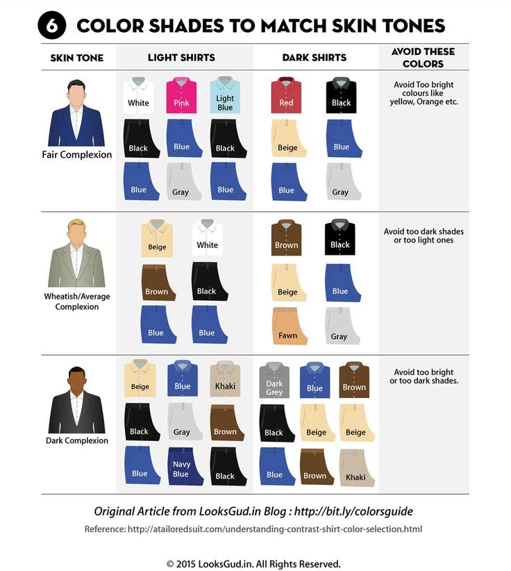 Изначально следует определить базовый цвет, служащий в дальнейшем основой. Как правило, эту роль играет тон пиджака. Под основной цвет подбирается остальная одежда, а не наоборот. Основное и главное правило: «Одеяние не должно содержать более трех цветов» . В противном случае очень сложно добиться гармоничного сочетания оттенков. Грамотно дополнить любой образ можно при помощи аксессуаров о которых мы с вами уже говорили не раз. Однако любое из украшений должно перекликаться в цветовом отношении с рубашкой.