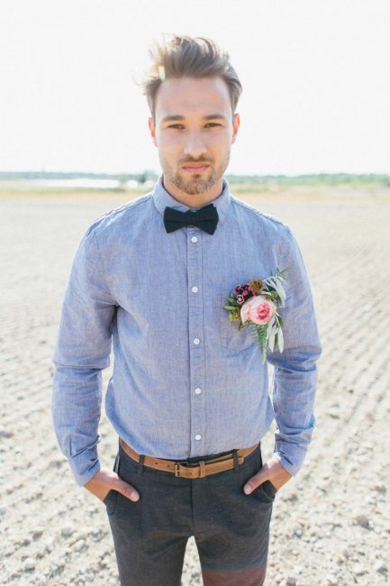 Чем хорош этот наряд? Все цвета, использованные в этом наряде, нейтральны, за исключением галстука-бабочки, что делает образ отличным акцентом. Рубашка имеет очень тонкий узор в переплетении, добавляющий немного глубины.