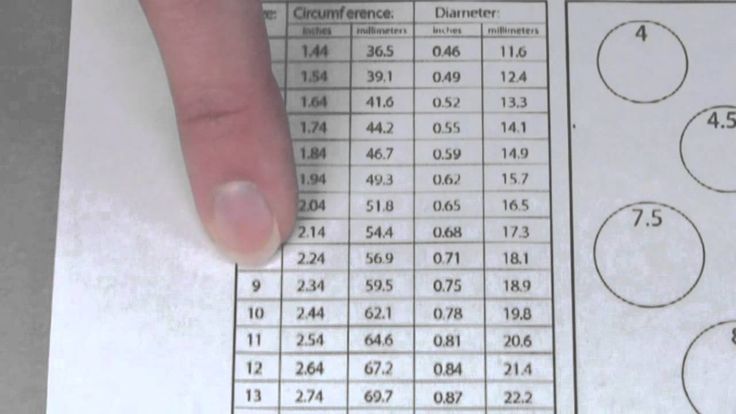 Посмотрите видео, где наглядно показано, как определить подходящую окружность колечка, соответствующую российской таблице:
