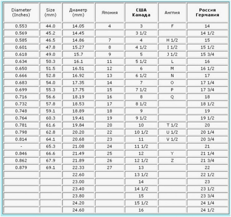 - Размеры колец. Таблица соответствия: Китай, Россия, США, Европа