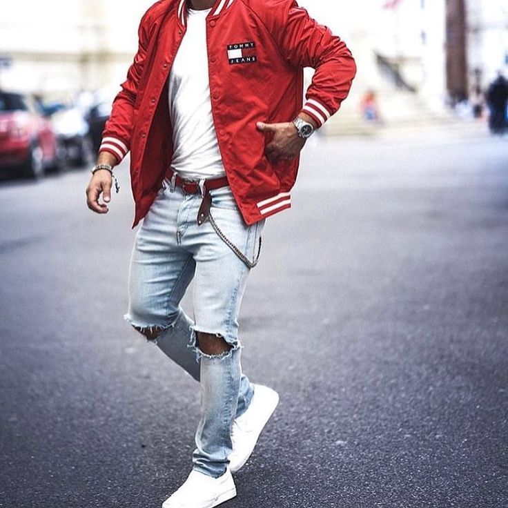 Костюм с красной университетской курткой Наденьте красную университетскую куртку поверх черной футболки и джинсов, чтобы создать образ плохого парня. Кепка и кроссовки придадут спортивный вид этому наряду.