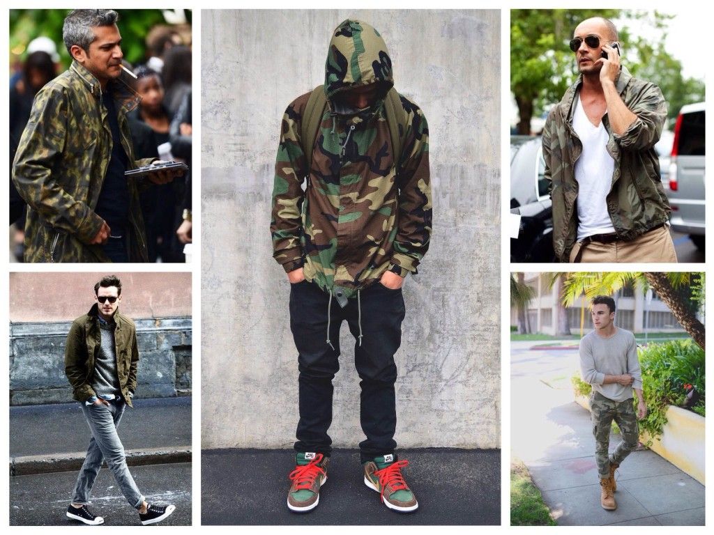 Однако военный образ с камуфляжной брюками одними только ботинками не ограничивается.
