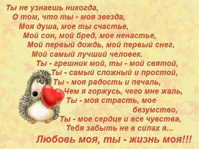 Я засыпаю и просыпаюсь с мыслью о том, как я счастлива, что именно ты рядом со мной. Так приятно знать, что у меня есть такой родной и близкий человек. С нетерпением я жду каждой встречи с тобой. Хочется рассказать всему миру о своих чувствах к тебе. Я люблю тебя.