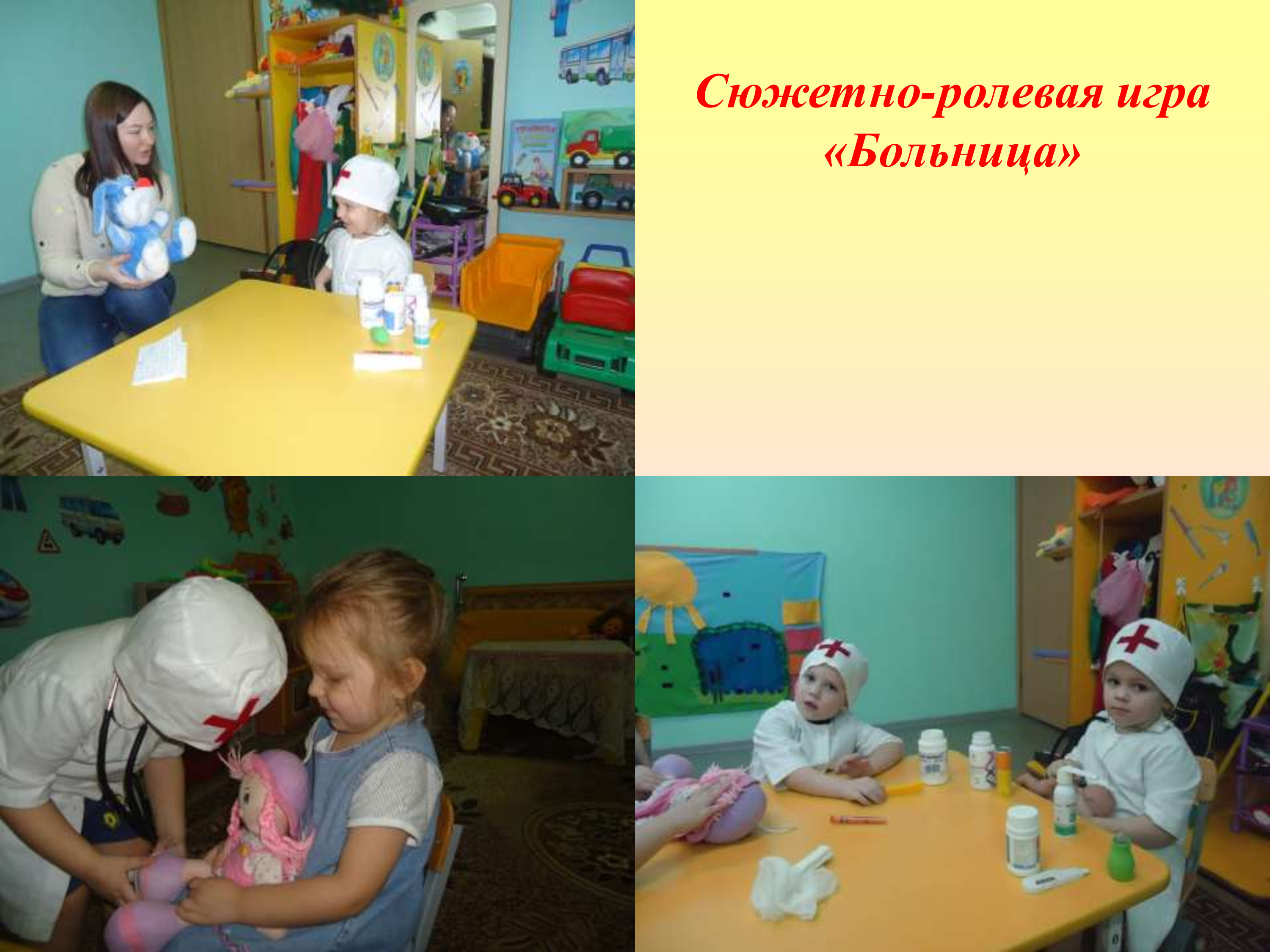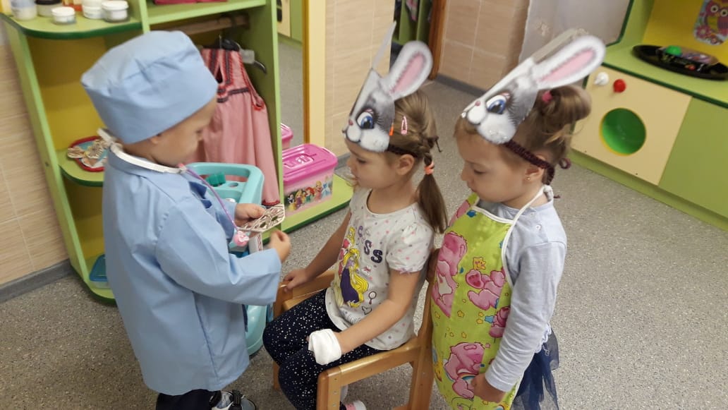 Здесь уже есть полноценная игровая ситуация и принятие на себя роли взрослых: в игре ребёнок становится то мамой, то папой, то врачом, то водителем автобуса.