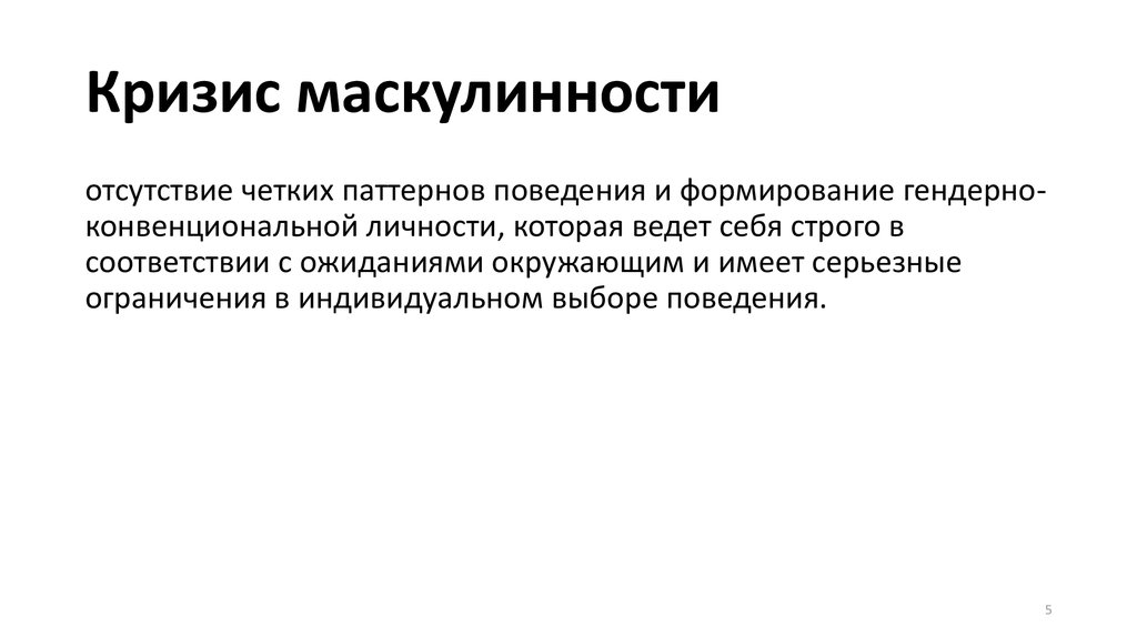 С тех пор концепция изменилась, и уже в 2010-х термин стали использовать для обозначения стереотипных норм мужественности, а именно ожиданий общества, что мальчики и мужчины должны быть активными, агрессивными, жёсткими, смелыми и доминирующими.