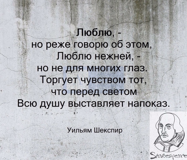 | 11:10 am: Шекспир. Сонет 102. Люблю,- но реже говорю об этом. Люблю нежней — но не для многих глаз. Торгует чувством тот, кто перед светом Всю душу выставляет напоказ. Тебя встречал я песней, как приветом, Ночь не лишится прелести своей, И я умолк, подобно соловью. Сонет 74. Когда меня отправят под арест Мне памятником будут эти строчки. Ты вновь и вновь найдешь в моих стихах С тобою будет лучшее во мне, Ей — черепки разбитого ковша, Шекспир!!! Красиво! Люблю нежней — но не для многих глаз. Торгует чувством тот, кто перед светом Всю душу выставляет напоказ.» если бы Вы не сказали, что это Шекспир, я бы решила, что это кто-то из наших известных поэтов. Надо же.