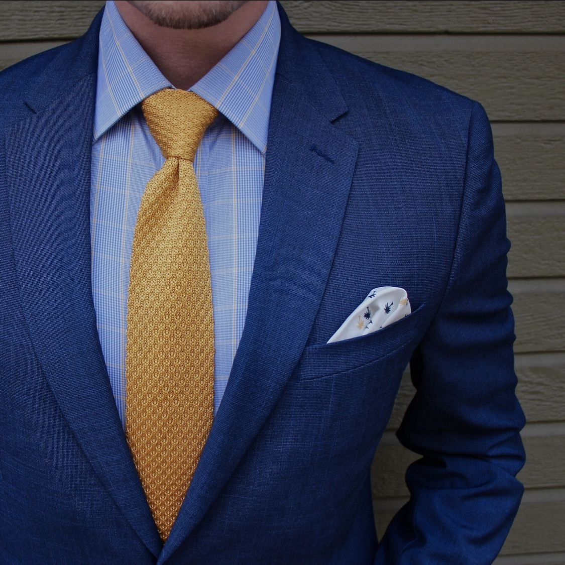 Триадные цвета (три цвета, равномерно расположенные на цветовом круге) для синего — красный и желтый. Универсальность синего помогает дополнить соответствующие цвета галстуков такими оттенками, как бордовый, темно-бордовый и золотой.