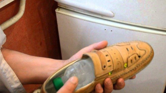 - туфли, заполненные пакетами с водой, поставить в морозильное отделение на 6-8 часов. При замерзании вода станет расширяться, соответственно, растянется обувь;