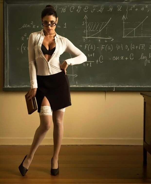 Как должна выглядеть учительница, чтобы возбудить не мальчика, но мужа? Строгая классическая юбка, сужающаяся к коленям, белая рубашка с расстегнутыми пуговицами сверху и приспущенным галстуком, очки, забранные в пучок волосы и, конечно, ножки в чулках и на высоком каблуке. Строгий взгляд и указка, конечно. Заметьте, — указка весьма символичный предмет!