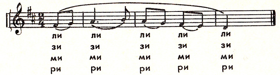Мо-Ме-Ми-Му-Ма по тризвуку. Резко, отрывчато.