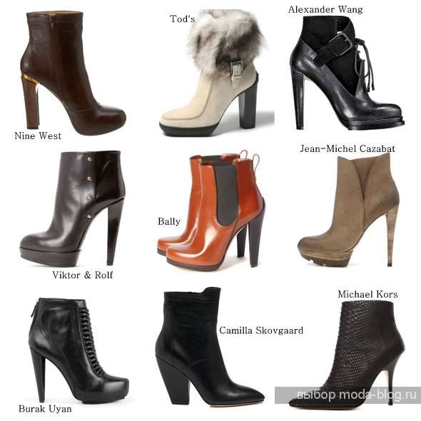 - Ботильоны. Высокий каблук – лучшее решение для торжественных мероприятий, а для повседневной носки можно подобрать шузы со средним. К парам на каблуке средней длины подойдет даже самый лаконичный наряд с минимумом деталей.