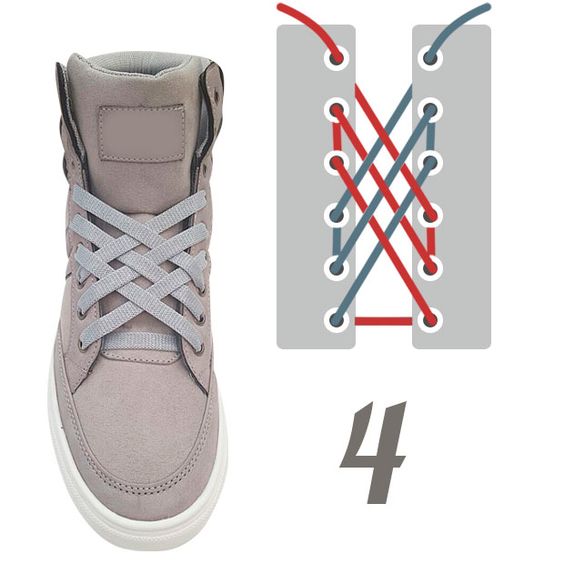 Выглядит очень декоративно. Подходит для моделей с 6 парой отверстий и более. Плетётся сначала одной частью шнурка, после чего вторая часть пропускается сквозь получившуюся решётку в противоположном направлении.