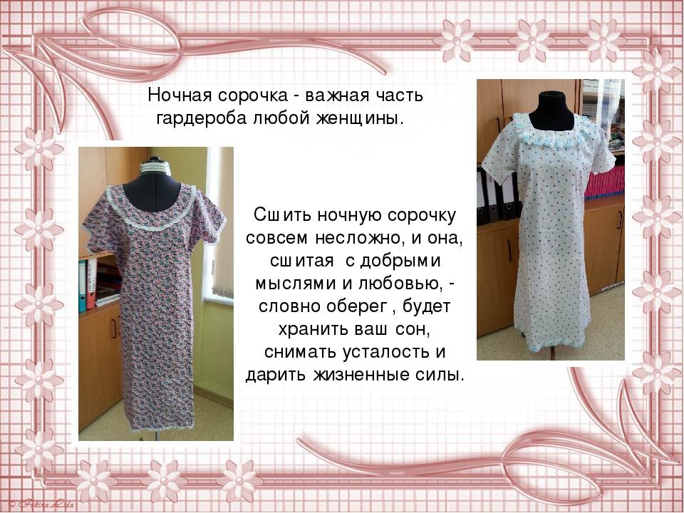 ЗаключениеТакой простой, на первый взгляд, элемент домашней одежды, как ночнушка – на самом деле имеет множество вариаций. Ночные сорочки различаются по длине изделия, длине рукава, форме выреза, по сезону и даже по предназначению.