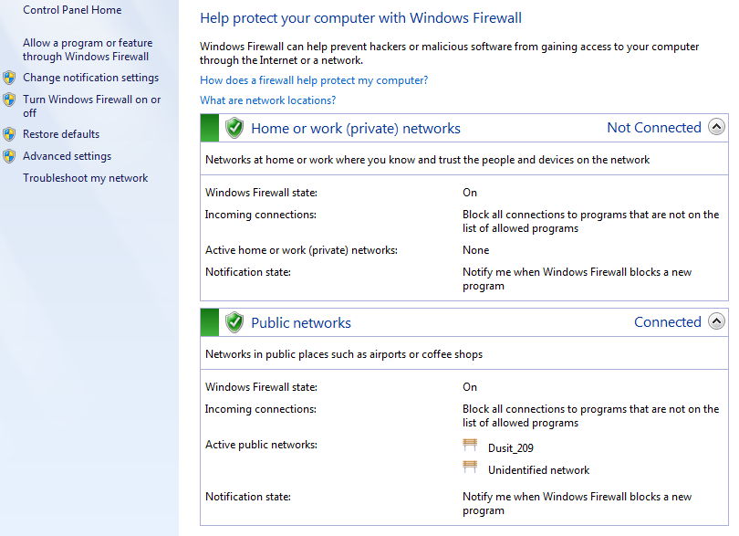 Входящий брандмауэр WF включён по умолчанию. Если вы ничего не измените, брандмауэр Windows будет включён для всех подключений на вашем компьютере. Например, если у вас есть кабель локальной сети, карта беспроводной сети и USB-карта 3G на определённом ПК, WF включён для всех них. Брандмауэр Windows отключается только в том случае, если вы намеренно отключаете его или если сетевой администратор вашей крупной корпоративной сети решает отключить его с помощью удалённого управления или установить пакеты обновления Windows с отключённым брандмауэром.
