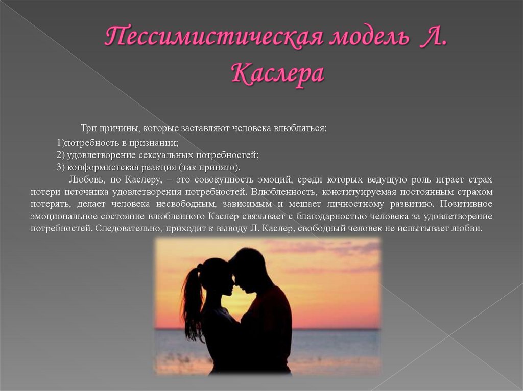 (Изображение предоставлено: Джон Стилвелл — WPA / Getty Images) Те, кто глубоко влюблен, обычно испытывают сексуальное желание к своему возлюбленному, но к ним прилагаются сильные эмоциональные нити: тяга к сексу сочетается с собственничеством , стремление к сексуальной исключительности и крайняя ревность, когда партнера подозревают в неверности. Считается, что это собственничество развилось так, что влюбленный человек заставляет своего партнера отвергать других женихов, тем самым гарантируя, что ухаживания пары не прервутся до тех пор, пока не произойдет зачатие.