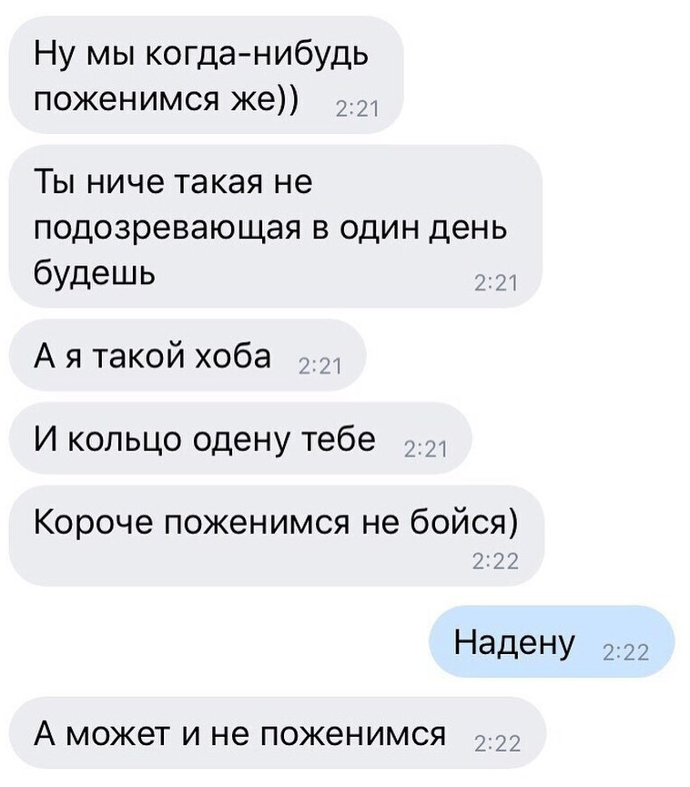 - Знаешь, я так не люблю пустую болтовню! Может, сразу поженимся, заведем кучу детишек и возьмем прелестный домик в кредит?