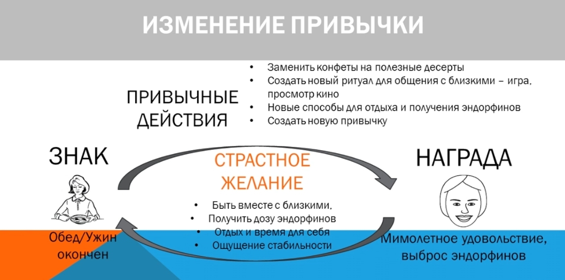 Итак, полезным привычкам даем зеленый свет, а неполезным формируем препятствие. Например, корзинку с фруктами ставим на стол, с конфетами — повыше в шкафчик. Проголодался — возьми яблоко. Или еще совет: не забывайте вовремя покупать продукты, которые закончились, и закладывать время на приготовление еды, чтобы не потянуться за быстрым бутербродом.