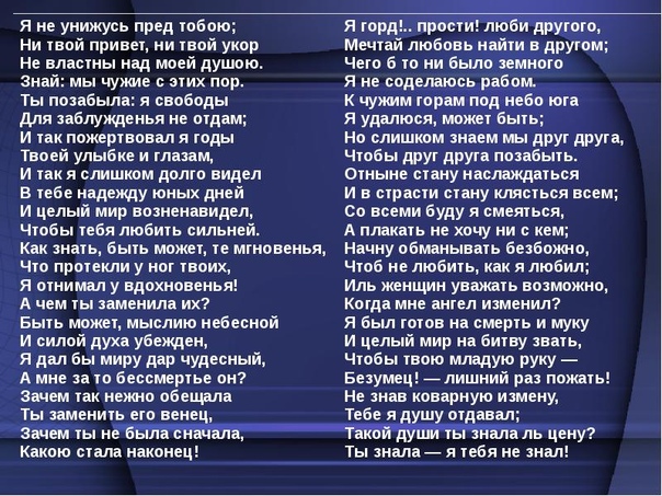 Я не буду унижаться перед тобой: Я не унижусь пред тобою — Лермонтов. Полный текст стихотворения — Я не унижусь пред тобою