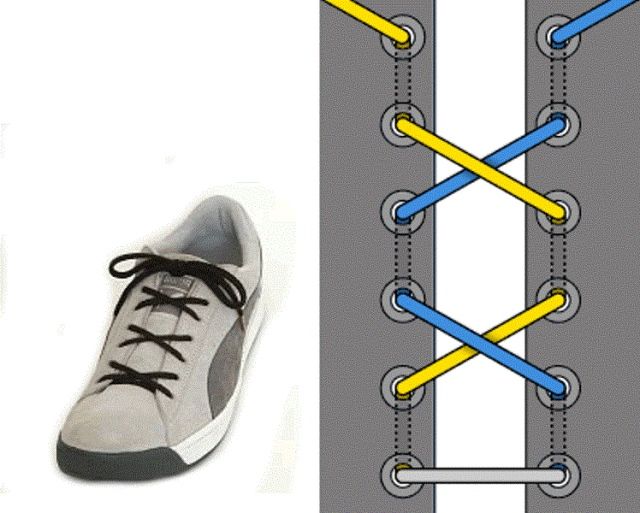 - Вы также можете зашнуровать обувь другими способами, как на картинке, чтобы шнурки заканчивались после прохождения через верхнее отверстие Zubits . Таким образом, вы также можете завязать шнурки в верхнем отверстии Zubits .