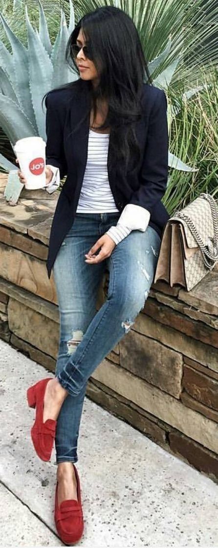 Примечания к стилю: Еще один образ, который демонстрирует, как идеально сочетать легкие джинсы с контрастной обувью и аксессуарами.![]()